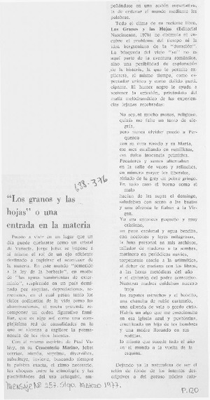 "Los granos y las hojas" o una entrada en la materia [artículo] / Alfonso Calderón. Mensaje (Revista : Chile)-- no. 257 (mar. 1977) p. 120-121. .