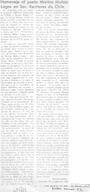 Homenaje al poeta Marino Muñoz Lagos en Soc. Escritores de Chile [artículo] / Hernán Cañas. El Magallanes (Punta Arenas, Chile)-- ago. 3, 1970, p. 3. .