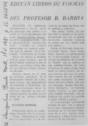 Editan libros de poemas del profesor R. Barria [artículo] / F. Cardenas. El Llanquihue (diario : Puerto Montt, Chile)-- mayo 17, 1981 p. 11. .
