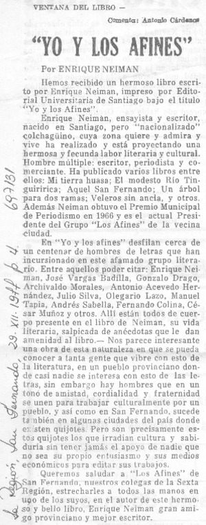 Yo y los afines [artículo] / Antonio Cárdenas Tabies. La Región (San Fernando, Chile)-- dic. 29, 1977, p. 4. .