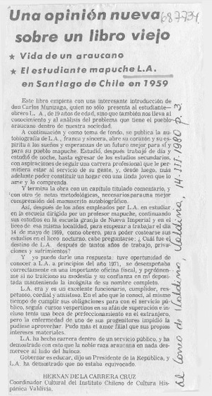 Una opinión nueva sobre un libro viejo [artículo] / Hernán de la Carrera Cruz. El Correo de Valdivia (Valdivia, Chile)-- mar. 14, 1980, p. 3. .