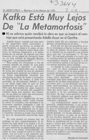 Kafka está muy lejos de "La metamorfosis" [artículo] / Rigoberto Carvajal. El Mercurio (Santiago, Chile)-- mar. 19, 1985, p. C11. .