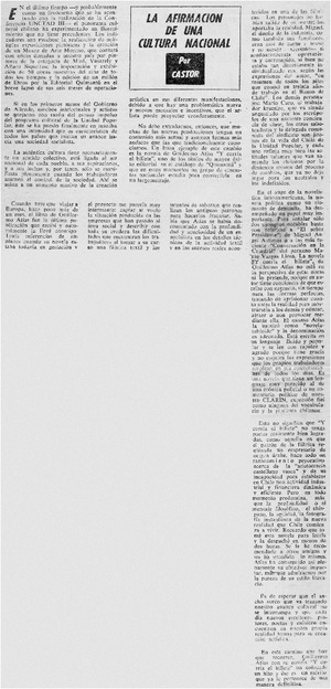 La Afirmación deuna cultura nacional [artículo] / Castor. Clarín (Santiago, Chile)-- mayo 9, 1972, p. 5. .