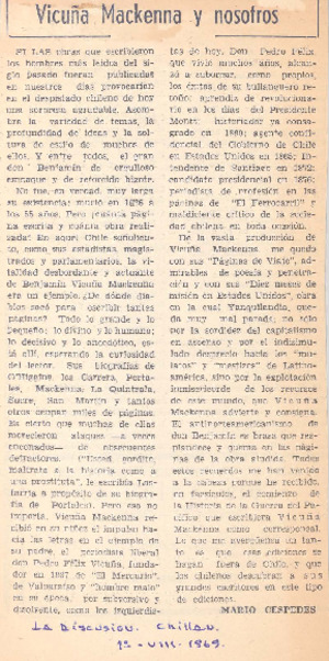 Vicuña Mackenna y nosotros [artículo] / Mario Céspedes. La Discusión (Chillán, Chile)-- ago. 1, 1969. .