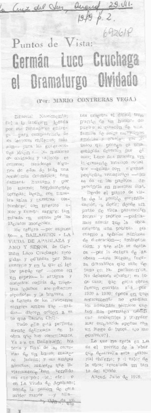 Germán Luco Cruchaga el dramaturgo olvidado [artículo] / Mario Contreras Vega. La Cruz del Sur (Ancud, Chile)-- jul. 29, 1979, p. 2. .