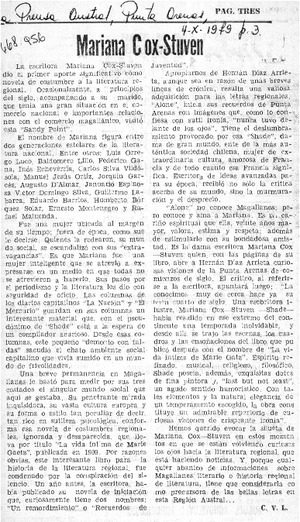 Mariana Cox-Stuven [artículo] / C. V. L. La Prensa Austral (Punta Arenas, Chile)-- oct. 4, 1979, p. 3. .