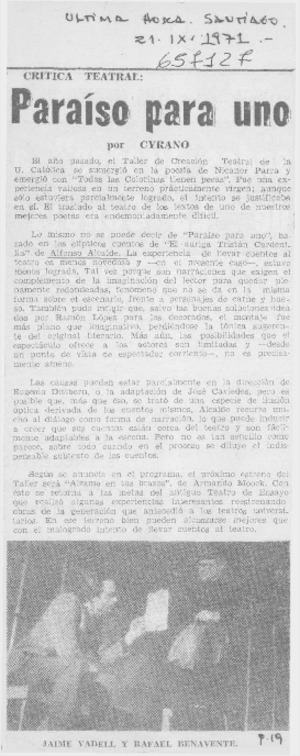 Paraíso para uno [artículo] / Cyrano. Ultima Hora (Santiago, Chile)-- sept. 21, 1971, p. 19. fot. .