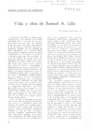 Vida y obra de Samuel A. Lillo [artículo] / Miguel Angel Díaz A. Occidente (Santiago, Chile)-- no. 233 (dic. 1971) p. 12-19 y 28. .