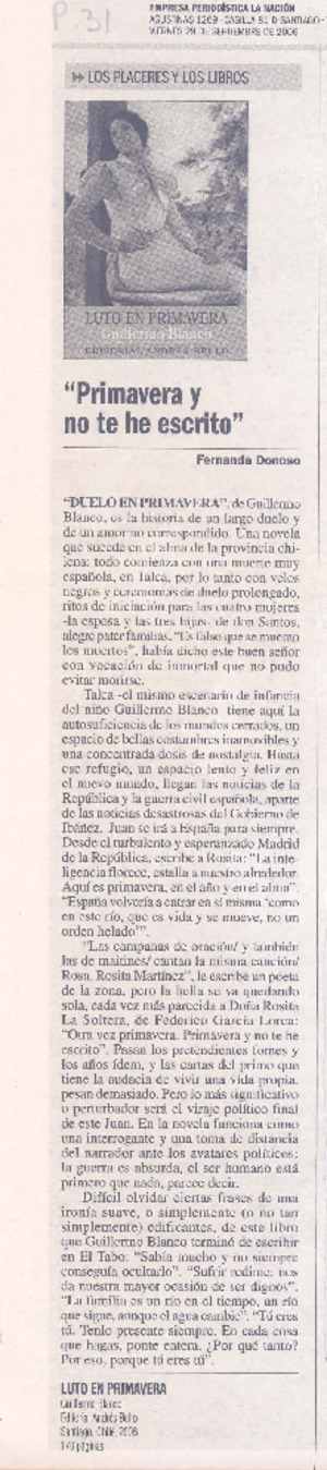 Primavera y no te he escrito [artículo] / Fernanda Donoso. La Nación (diario : Santiago, Chile)-- sept. 29, 2006, p. 31. .