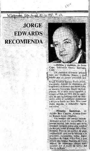 Jorge Edwards recomienda [artículo] / Jorge Edwards. La Segunda (Diario : Santiago, Chile)-- abr. 30, 1981, p. 15. retr. .