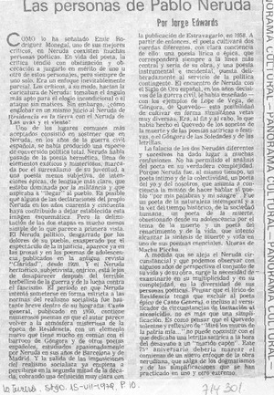 Las personas de Pablo Neruda [artículo] / Jorge Edwards. La Tercera (Diario : Santiago, Chile)-- jul. 15, 1979, p. 10. .