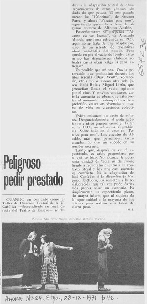 Peligroso pedir prestado [artículo] / H. E. Ahora (Santiago, Chile)-- no. 24 (sept. 28, 1971), p. 46. fot. .