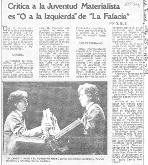 Crítica a la juventud materialista es "0 a la izquierda" de "La Falacia" [artículo] / S. Ele. La Tercera (Diario : Santiago, Chile)-- oct. 25, 1980, p. 31. retr. .