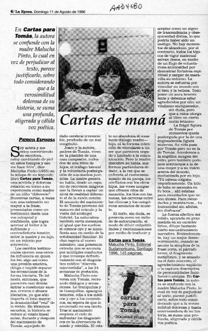 Cartas de mamá [artículo] / Patricia Espinosa. La Epoca. -- ago. 11, 1996, p. 6 (suplemento) retr. .