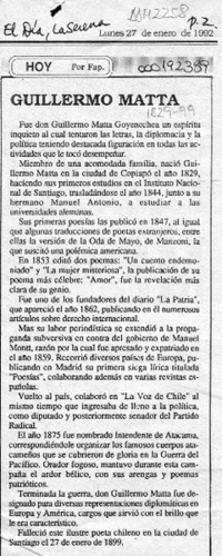 Guillermo Matta [artículo] / Fap. El Día (diario : La Serena, Chile)-- ene. 27, 1992, p. 2. .