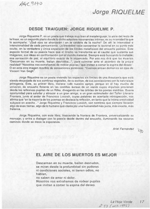 Desde Traiguén, Jorge Riquelme P. [artículo] / Ariel Fernández. La Hoja Verde. -- no. 53 (oct. 1995) p. 17 .