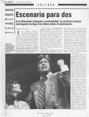 Escenario para dos [artículo] / Eugenia Fernández. Qué Pasa. -- no. 1095 (abr. 6, 1992) p. 50-51 retr. .