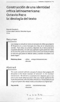 Construcción de una identidad crítica latinoamericana [artículo] / Ricardo Ferrada A. Literatura y Lingüística (Revista : Santiago, Chile)-- no. 15 (2004) p. 47-66 .