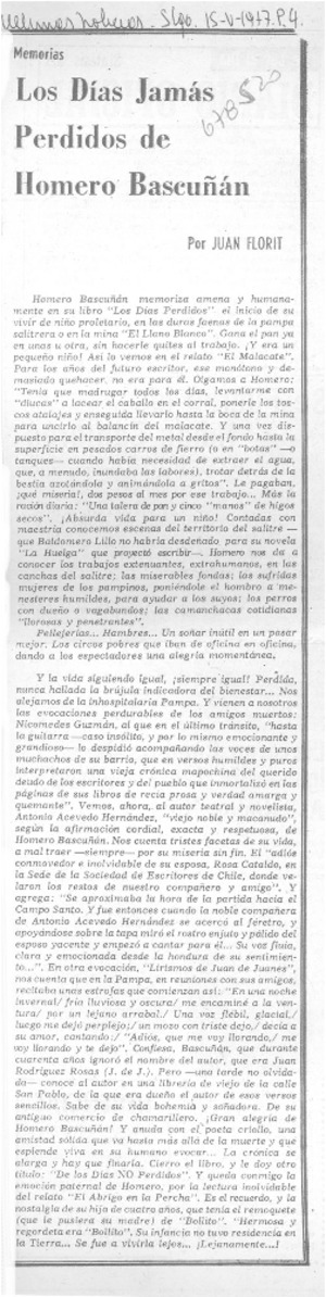 Los días jamás perdidos de Homero Bascuñán [artículo] / Juan Florit. Las Últimas Noticias (Diario : Santiago, Chile)-- mayo 15, 1977, p. 4. .