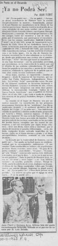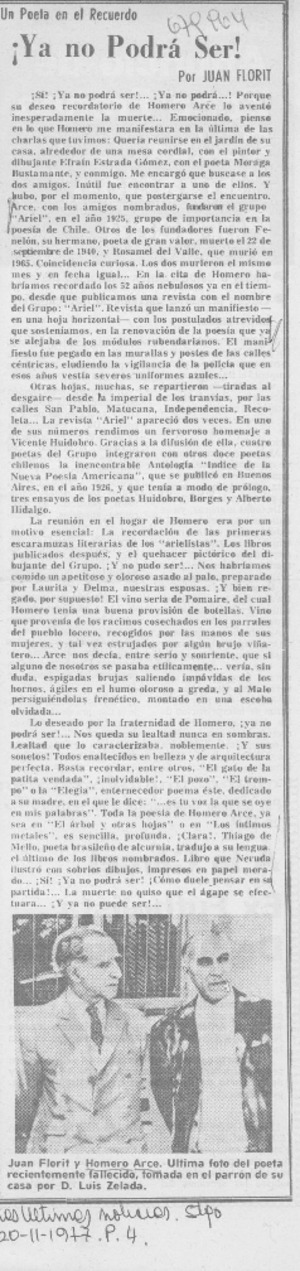 ¡Ya no podrá ser! [artículo] / Juan Florit. Las Últimas Noticias (Diario : Santiago, Chile)-- feb. 20, 1977, p. 4. retr. .