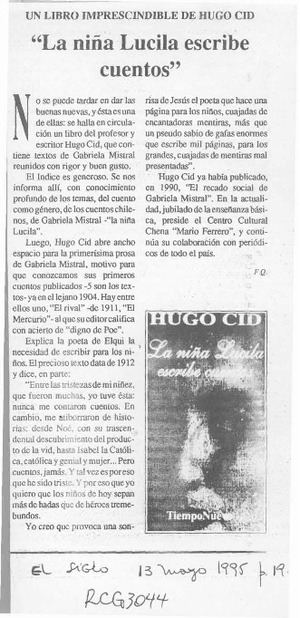 "La niña Lucila escribe cuentos" [artículo] / F. Q. El Siglo (diario : Santiago, Chile)-- mayo 13, 1995, p. 19 il. .