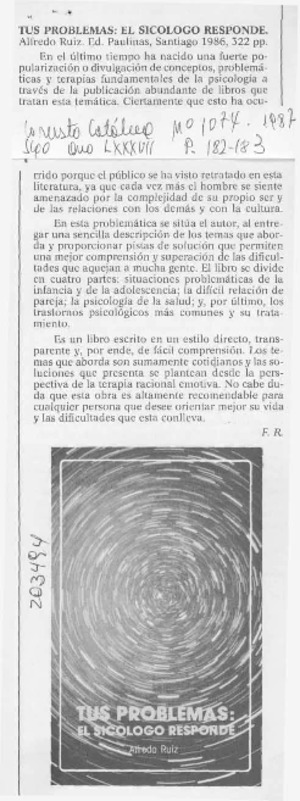 Tus problemas, el sicólogo responde [artículo] / F. R. La Revista Católica. -- no. 1074, 1987, p. 182-183 retr. .