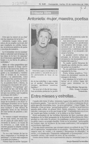 Antonieta, mujer, maestra, poetisa [artículo] / Sergio Ramón Fuentealba. El Sur (diario : Concepción, Chile)-- sept. 25, 1984, p. 2. retr. .