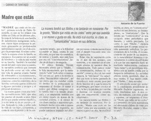 Madre que estás. [artículo] Antonio de la Fuente La Nación (Diario: Santiago, Chile)-- sept. 22, 2005, p. 32 retr. .