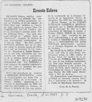 Ernesto Eslava [artículo] / Darío de la Fuente. La Provincia. -- nov. 17, 1984, p. 3. .