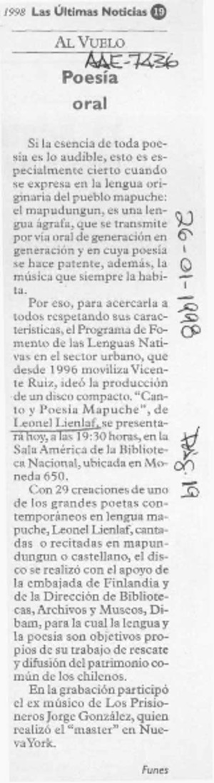 Poesía oral [artículo] / Funes. Las Últimas Noticias (Diario : Santiago, Chile)-- ene. 26, 1998, p. 19 .