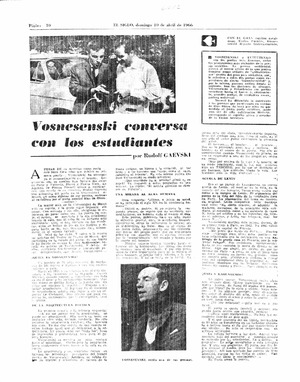 Vosnesenski conversa con los estudiantes [artículo] / Rudolf Gaevski. El Siglo (diario : Santiago, Chile)-- abr. 10, 1966, p. 10. retr. .