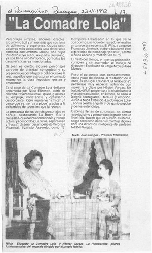 "La comadre lola" [artículo] / Juan Gangas. El Rancagüino. -- jun. 23, 1992, p. 17 retr. .
