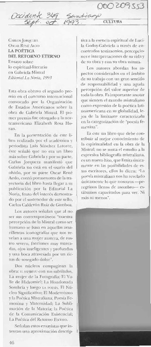 AEDO INOSTROZA, OSCAR - CALDERON, TERESA - CARDENAS, MARIO - DOCE POETAS CHILENOS DE ORIGEN ARABE - FUENTES DE PODER Y DEMOCRACIA - GUTIERREZ OJEDA, GABRIEL - González-Urízar, Fernando - JORQUERA ALVAREZ, CARLOS - JUVENAL HERNANDEZ JAQUE, LA FUERZA DE LA UNIVERSIDAD - LARRAHONA KÄSTEN, ALFONSO - Mistral, Gabriela - Neruda, Pablo - POETAS HISPANOAMERICANOS PARA EL TERCER MILENIO - POETICA DEL RETORNO ETERNO - RAFIDE, MATIAS - Saber del corazón