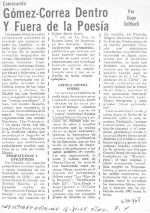 Gómez-Correa dentro y fuera de la poesía [artículo] / Hugo Goldsack. Las Últimas Noticias (Diario : Santiago, Chile)-- nov. 16, 1974, p. 4. .