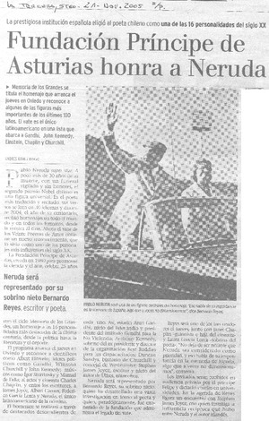Fundación Príncipe de Asturias honra a Neruda. [artículo] Andrés Gómez Bravo La Tercera (Diario: Santiago, Chile)-- nov. 21, 2005 retr. .