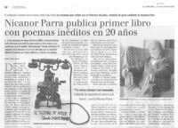 Nicanor Parra publica primer libro con poemas inéditos en 20 años [artículo] / Andrés Gómez Bravo. La Tercera de Hora (Diario : Santiago, Chile)-- abr. 29, 2005, p. 52. retr. .