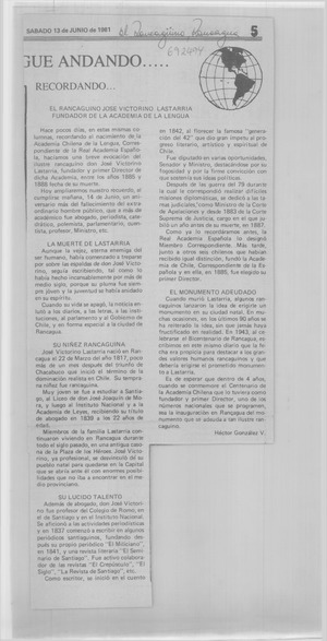 El Rancagüino José Victorino Lastarria fundador de la Academia de la lengua [artículo] / Héctor González V. El Rancagüino (Rancagua, Chile)-- jun. 13, 1981, p. 5. .