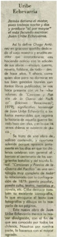 Uribe Echeverria [artículo] / H. Las Últimas Noticias (Diario : Santiago, Chile)-- jun. 2, 1979, p. 5. .