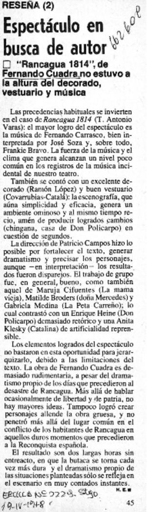 Espectáculo en busca de autor [artículo] / H. E. Ercilla (Santiago, Chile)-- no. 2229 (abr. 19, 1978) p. 45. .