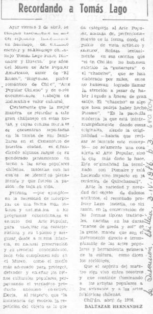 Recordando a Tomás Lago [artículo] / Baltazar, Hernández. La Discusión (Chillán, Chile)-- abr. 3, 1976, p. 3. .