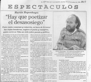 "Hay que poetizar el desasosiego" [artículo] / A. N. El Mercurio (Valparaíso). -- nov. 22, 1998, p. B17 retr. .