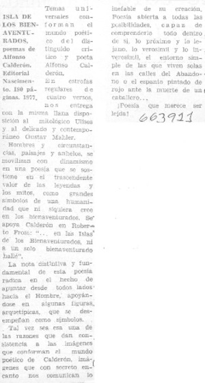 Isla de los bienaventurados. [artículo] / Carlos R. Ibacache I. La Discusión (Chillán, Chile)-- nov. 12, 1977, p. 3. .