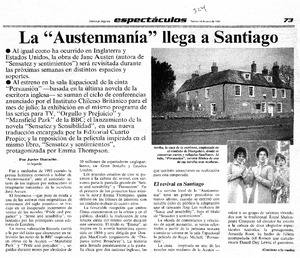 La "Austenmanía" llega a santiago [artículo] / Javier Ibacache. La Segunda (Diario : Santiago, Chile)-- jun. 14, 1996, p. 73. .