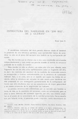 Estructura del narrador en "Job-Boj", de J. Guzmán [artículo] / René Jara C. Signos (Valparaíso, Chile)-- no. 1 (primer semestre 1971) p. 49-68. .