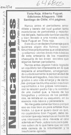 Nunca antes [artículo] Juan Pablo Jiménez La Prensa (Curicó) nov. 3, 2002, p. 3 (suplemento "Domingo en familia") .