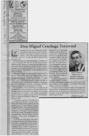 Don Miguel Cruchaga Tocornal [artículo] Zenón Jorquera Figueroa La Tribuna (Los Ángeles) mayo 5, 2001, p. 3 retr. .