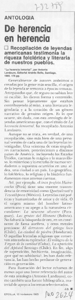 De herencia en herencia [artículo] / J. Q. Ercilla (Revista : Chile)-- no. 2624 (nov. 13, 1985). .
