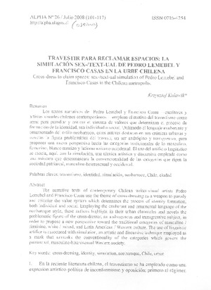 Travestir para reclamar espacios [artículo] / Krysztof Kulawik. Alpha (Revista : Osorno, Chile)-- no. 26 (jul. 2008) p. 101-117. .