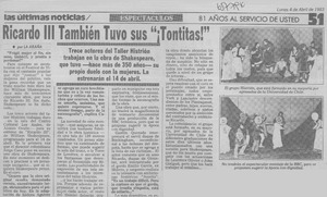 Ricardo III también tuvo sus "¡Tontitas!" [artículo] / La Araña. Las Últimas Noticias (Diario : Santiago, Chile)-- abr. 4, 1983, p. 51. retr. .