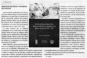 Navegantes británicos y holandeses en el Pacífico [artículo] / A. Larreta. La Segunda (Diario : Santiago, Chile)-- ago. 28, 2003, p. 3 (suplemento "Nuestro Mar") il. .